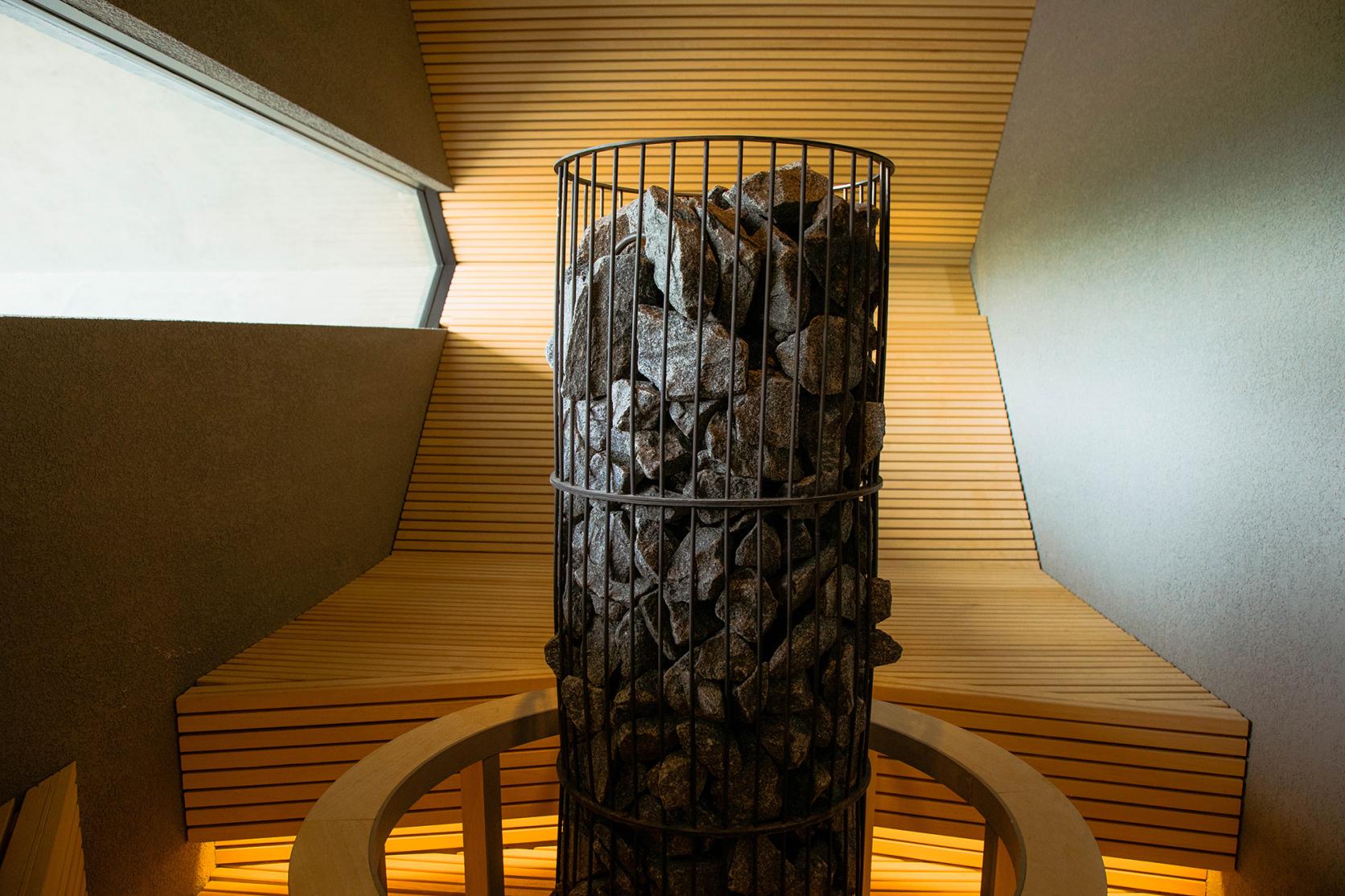 The hexagonal structure from which The Hive gets its name is functional as well as striking: being partly subterranean, and covered with earth and foliage, helps ensure that the building is cool in summer and warm in winter. Inside, two private Finnish-style saunas—one for group use; the other for solo enjoyment—feature “widescreen”-style windows with panoramic views.