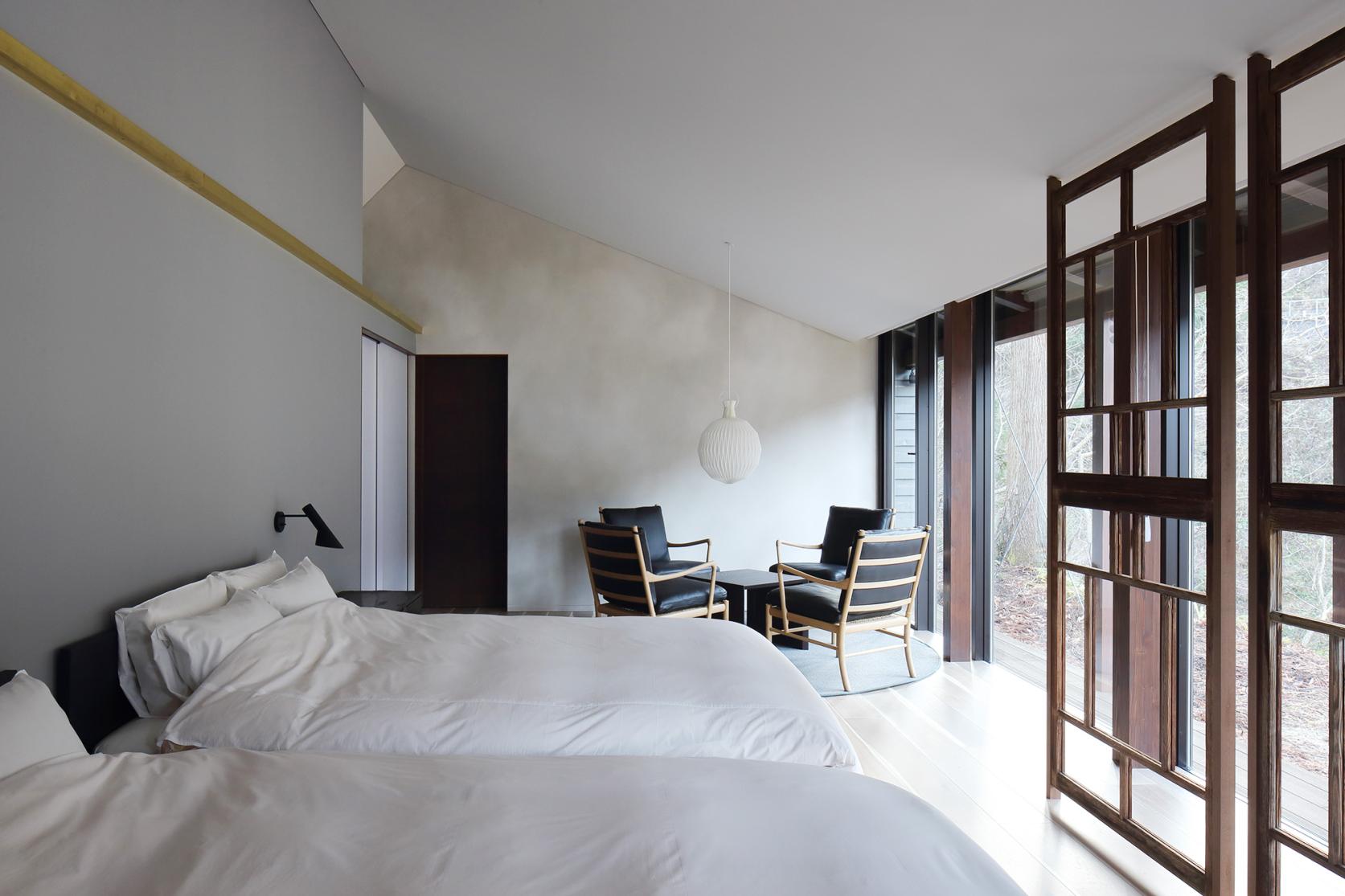 The hotel focuses upon guests’ relaxation and revitalization via a muted and contemplative form of luxury. Each of the three guest rooms is named for the material upon which its interior design is themed: the “Paper” room, for example, has walls and ceilings covered in traditional washi paper. These rooms, as well as communal areas, feature an eclectic selection of artwork and furniture both Japanese and Western, traditional and contemporary.