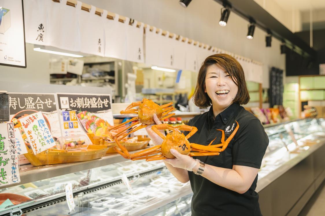 구로베 어업협동조합 직영점인 ‘사카나노에키 이쿠지‘는 구로베 어항 근처에 자리한 시설입니다. ’데키타테칸‘에 있는 레스토랑 ’고카이토‘에서는 신선한 해산물을 사용한 회와 해물 덮밥 등을 맛볼 수 있습니다. 가을~봄 시즌의 추천 요리는 베니 즈와이가니의 게살을 듬뿍 올린 ’게 덮밥‘이며, 각종 덮밥에는 베니 즈와이가니를 넣은 일본식 된장국이 세트로 제공됩니다. 주말에는 구로베 지역에서 유일하게 베니 즈와이가니 잡이를 나가는 ’에비스마루‘의 스태프들이 게를 판매하기도 합니다. 게딱지의 폭이 넓고 맛있는 게살이 꽉 들어차있는 베니 즈와이가니에는 일급품질임을 나타내는 이쿠지만의 독자적인 태그가 붙어있습니다.