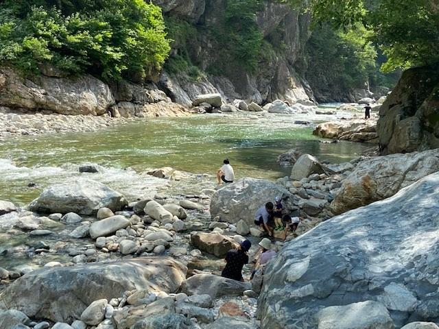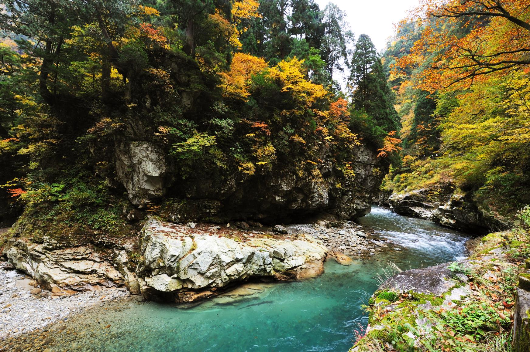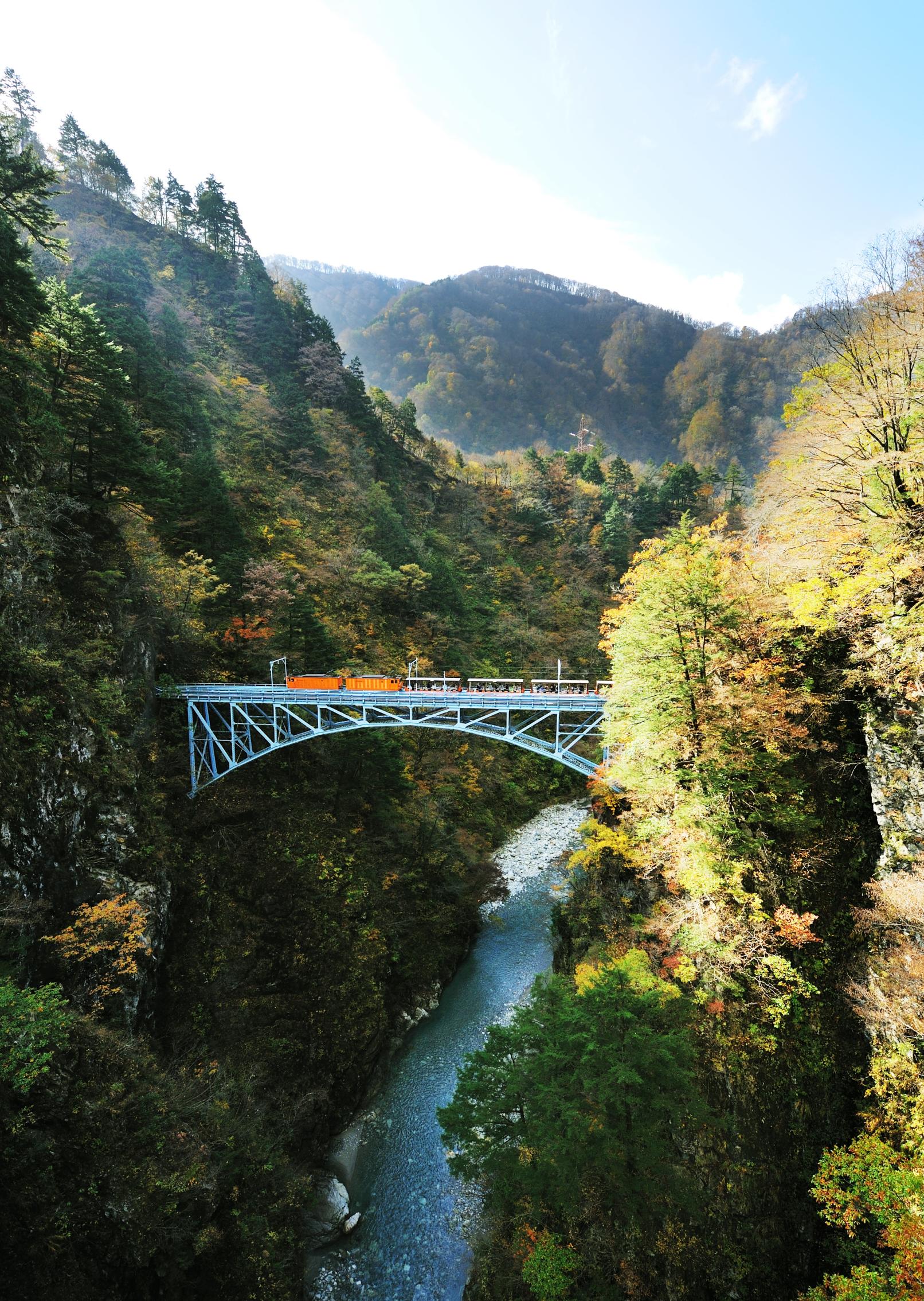 乘坐簡易小火車用單程1小時20分鐘巡遊大自然的鐵道。所說春季的新綠、夏季的清澈流水、秋季的紅葉四季應時的值得觀賞的地方很多。穿越過幾個橋和幾個隧道就把大自然穿通過去。中途的絕景有架在黒薙河上60公尺高的後曵橋、隱蔽的露天溫泉鐘釣溫泉、及所說的紅葉出名的錦繡關等很多的絕景!在中途的鐘釣站和櫸平站裡有餐廳和土特產禮品店、可以休息和用餐。用上1天的時間慢慢地飽嘗黑部峽谷的大自然吧!