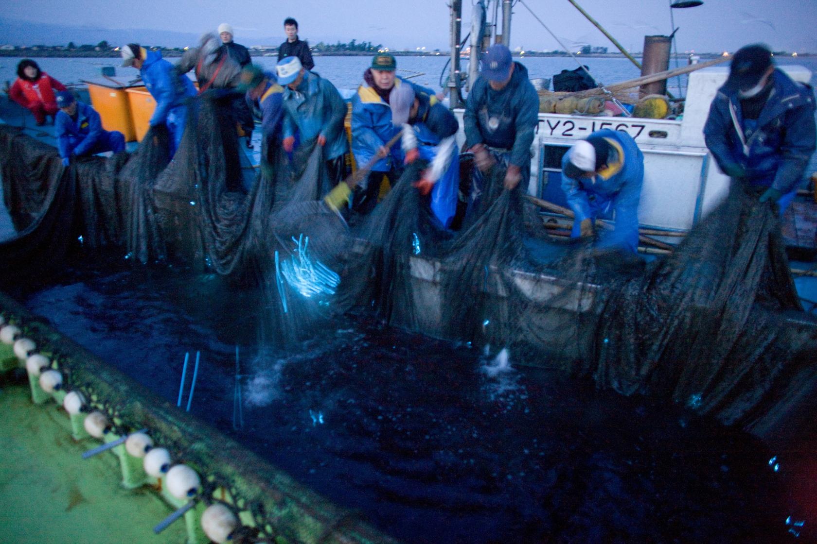 此種方法會沿海岸線放置漁網,然後等待魚群游入。漁網的網眼寬 30 公分,可確保僅捕獲特定大小和成熟度的魚類,長度小於 30 公分的魚類則可從漁網中游出。在富山灣,固定岸網通常會設置在距離港口 4 公里處,而漁船也可在 20 分鐘內到達此處。從富山灣捕獲的漁獲中,有 80% 以上都是採用固定岸網的方式捕撈,